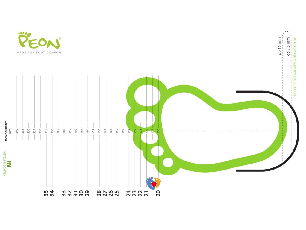 Orientačná tabuľka veľkosti detskej prezúvkovej obuvi Peon MI. Pri výbere obuvi je potrebné dbať na to, aby bol zachovaný minimálny nadmerok obuvi - voľný priestor od najdlhšieho prstu nohy po špičku topánky. U deti sa doporučuje nadmerok od 0,5-1,5 cm, závisí od typu a šírky chodidla a výšky priehlavku. Vhodnú veľkosť papúč PEON® si viete určiť buď odmeraním chodidla v stoji, alebo vytlačením šablóny a postavením sa na šablónu.