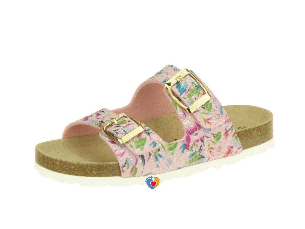 Rega Shoes C466 sú pohodlné detské šľapky s veselým kvetinovým motívom, navrhnuté na každodenné nosenie doma aj vonku. Dva nastaviteľné pásiky so zlatou prackou umožňujú prispôsobiť obuv rôznym šírkam nohy. Mäkká, anatomicky tvarovaná stielka podporuje zdravý vývoj detských chodidiel a zaisťuje príjemný krok. Ľahká korková podošva s protišmykovou úpravou tlmí nárazy a nefarbí podlahy. Je to skvelá obuv na leto, do škôlky, školy, ako aj na dovolenku.