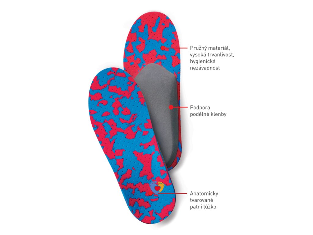 - Ortopedicky tvarovaná stielka je vyrobená z kvalitnej gumy, zabezpečujúca podporu pozdĺžnej klenby chodidla.