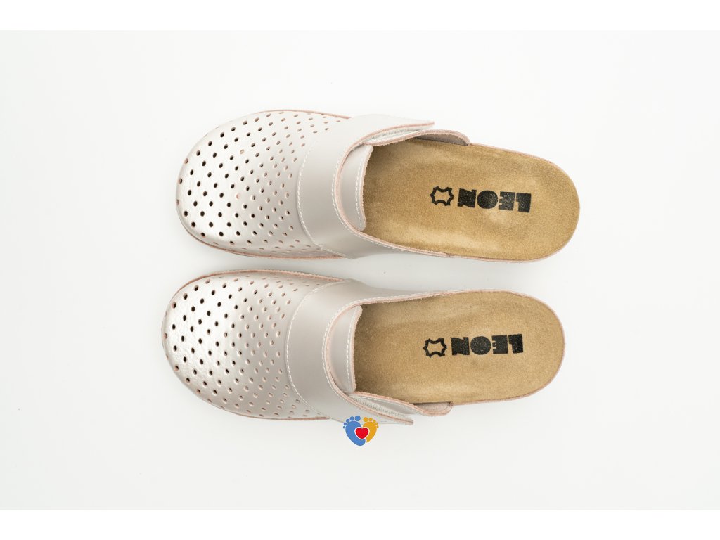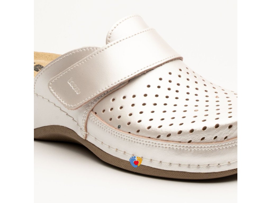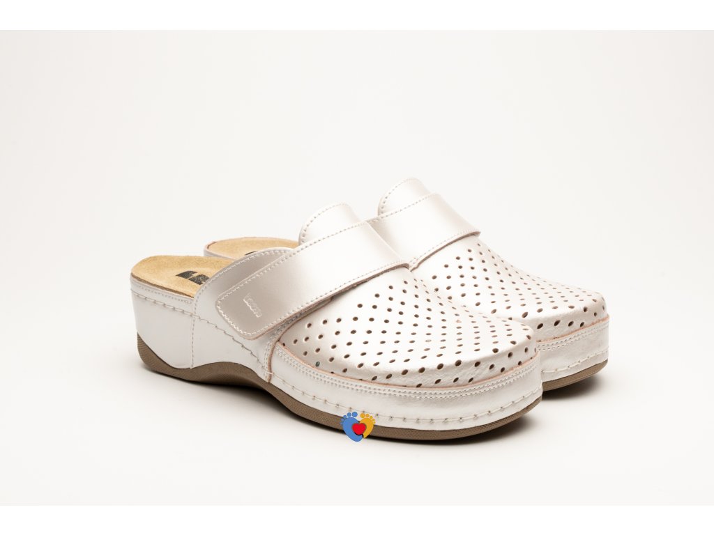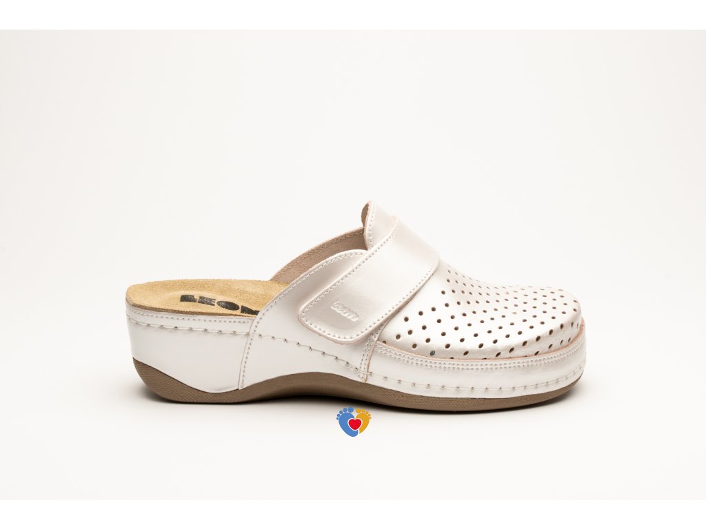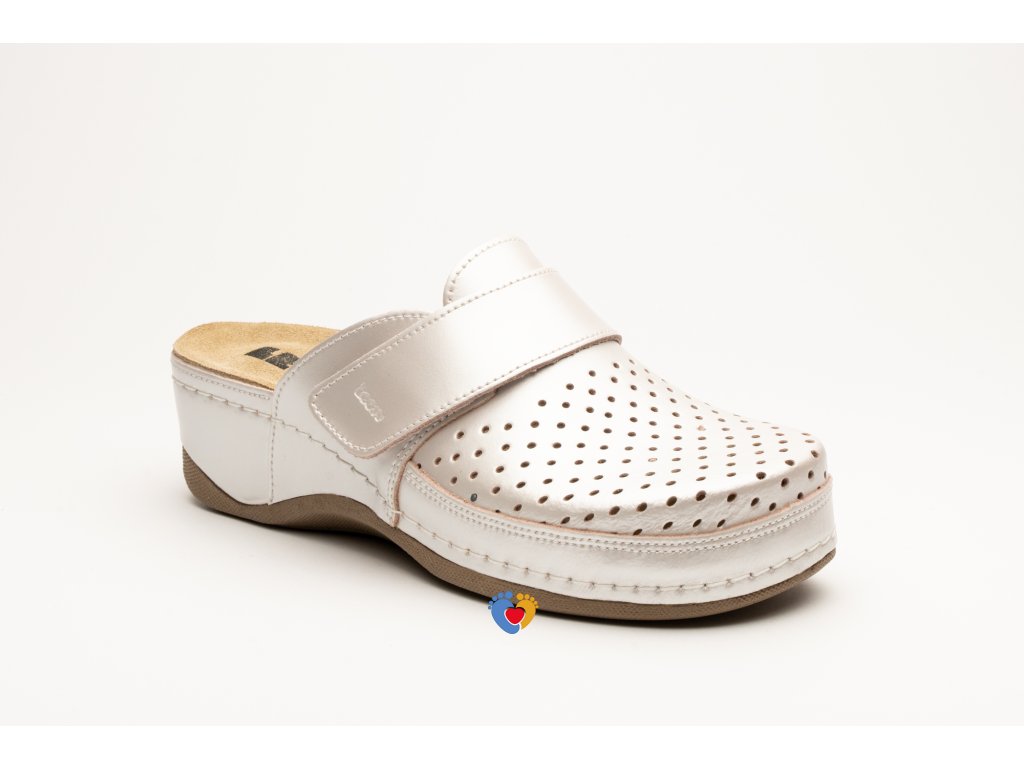 Zvršok: plná špička z prírodnej hladkej kože. Prírodný kožený materiál a perforácia hornej časti zabezpečuje priedušnosť. Nastaviteľnosť priehlavku zabezpečuje remienok so suchým zipsom - zabezpečuje stabilitu chodidla. Vďaka dostatočnému priestoru pre prsty je vhodná aj pre osoby s Hallux Valgus / vybočeným palcom/.